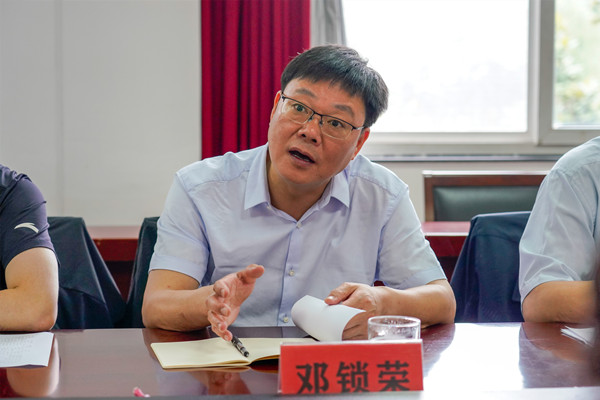 会上,我校校长邓锁荣首先作了学校省级男篮和女排业余训练点的工作推进情况汇报。