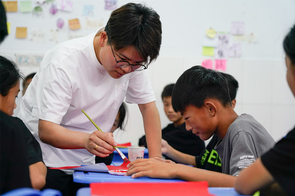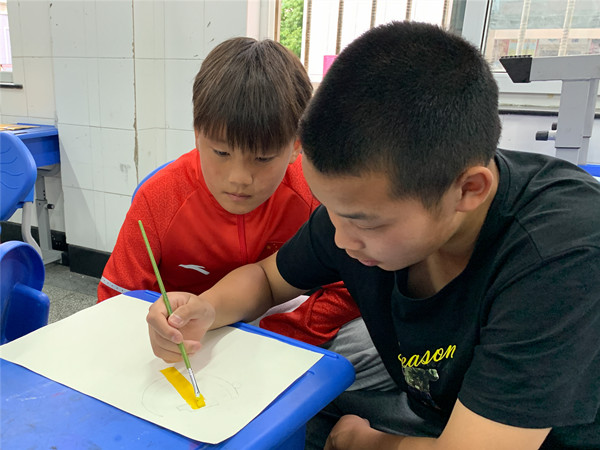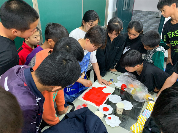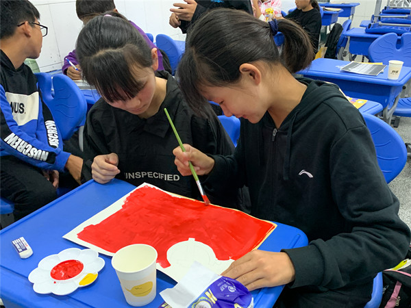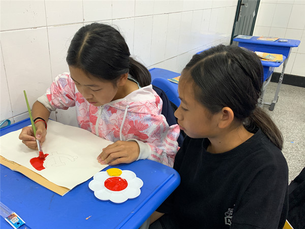 走进课堂,美术老师黄文迪正在指导同学们如何绘制党旗,打底稿、调色、上色,每一个环节黄老师都亲自示范、悉心指导,为了既保证活动完成的质量,又能使每个同学都参与到活动中,根据学生能力和特长的不同,黄老师在课前巧妙灵活地进行了小组分工。同学们在各自的“工作岗位”中各司其职,不敢有一丝马虎和懈怠。
