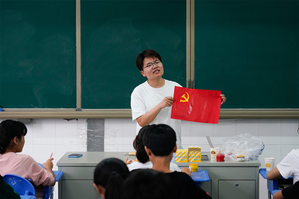 带着大家的疑问,黄老师介绍了党旗的组成、含义和由来,并要求每位同学结合在近期开展的“主题板报看我的”“红色电影月月看”和 “党史故事我来讲”等专题活动中的所学、所思、所感,写下对党旗、祖国的祝福和寄语。