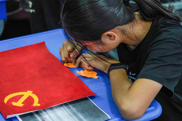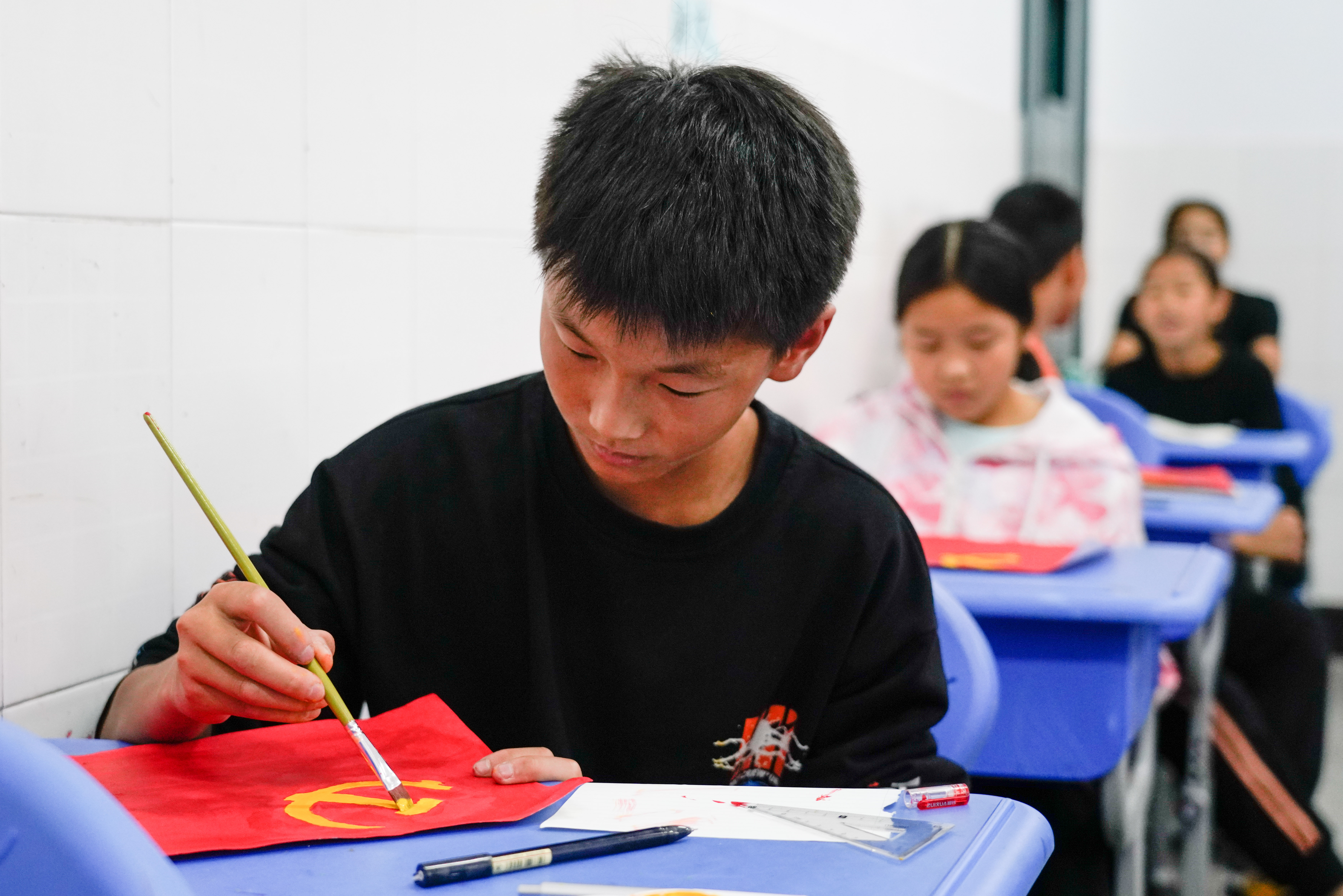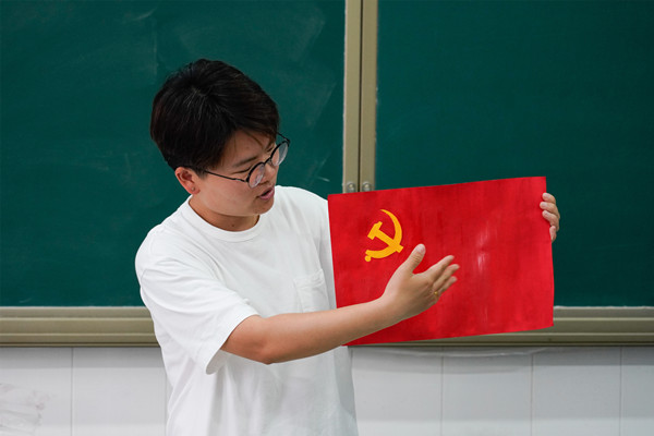 “老师,党旗就是中国共产党的旗帜吗?”“老师,为什么党旗上是一把镰刀和一把锤子呢?”“老师,为什么党旗和国旗一样都是鲜红的?”看着绘制完成的一面面党旗,六年级的同学们发出了稚嫩的提问。