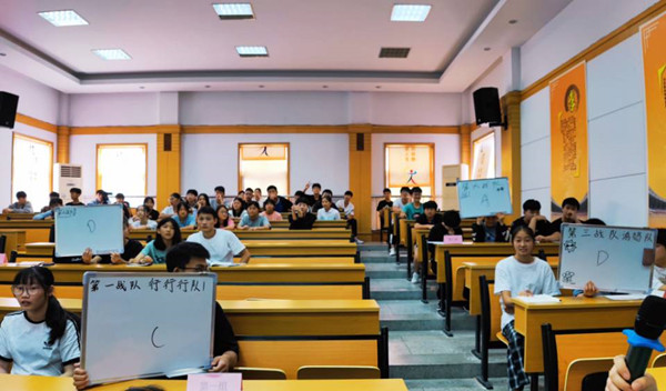 竞赛分两轮进行,由七、八、九年级学生混合组队参加,每组人数为4人。第一轮竞赛采取开卷笔答的方式进行,题目内容主要围绕法律常识和党史知识,竞赛题满分100分,时间45分钟,参赛学生单人单座,独立完成竞赛题,最终按照组队总分进行排名。第二轮竞赛以小组为单位采用活动、题目抢答方式进行。