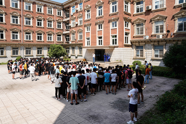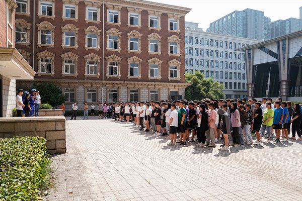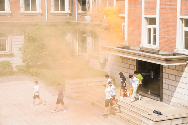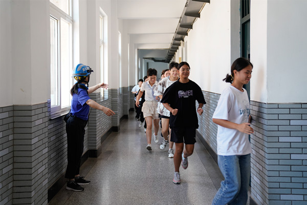 上午9点,随着警报的响起,各班学生在蓝天救援队和老师们的指挥下,按照预定逃生路线迅速有序地离开教学楼,撤离到广场上的安全地带。