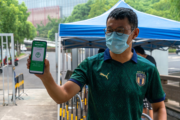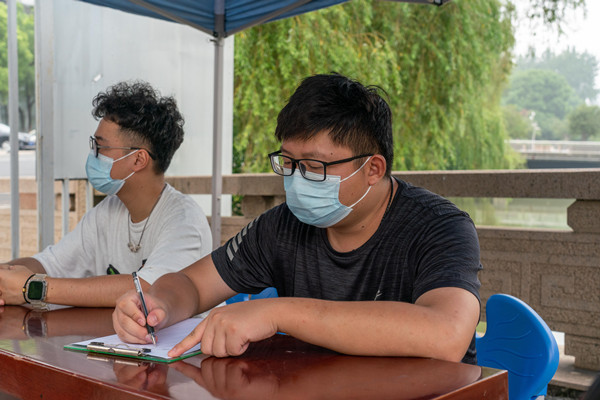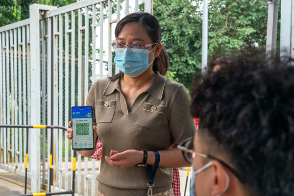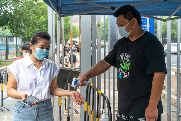 通道入口处,3位教职工依次负责对“学生”进行查验健康码、测量体温和登记。