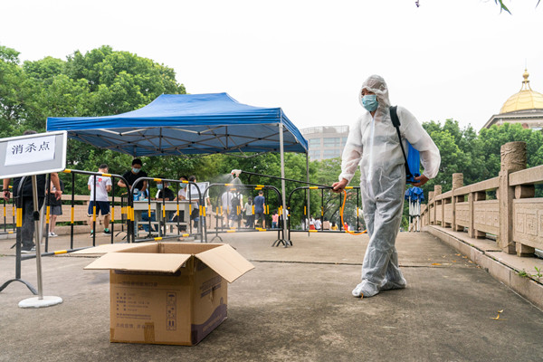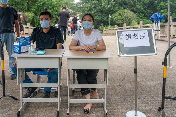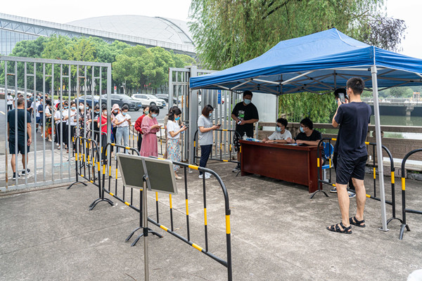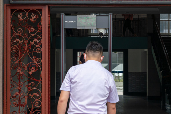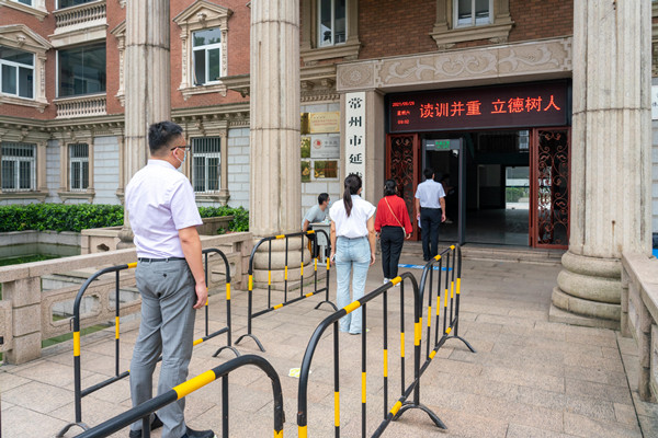 “请大家戴好口罩,相互间保持1米间距。”上午9∶00,教职工们扮演成“学生”,排成一列,从亚龙桥东侧通道依次有序进入校园。