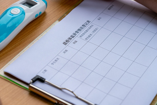 进入校园后,“学生”用免洗消毒洗手液洗手,并进行入学报到登记。如发现有发热、呼吸道等症状的“学生”,则由身着防护服的校医带到隔离点,做好记录,并用水银体温计进行二次测量,时间间隔不少于10分钟,体温正常可正常报到,体温不正常则由家长带回就医。