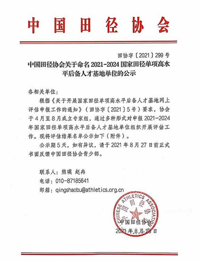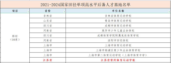 经过专家组4个多月的评估,近日,我校成功入选《2021-2024国家田径单项高水平后备人才基地名单》,成为江苏省唯一一家“国家跨栏高水平重点项目后备人才基地”。
