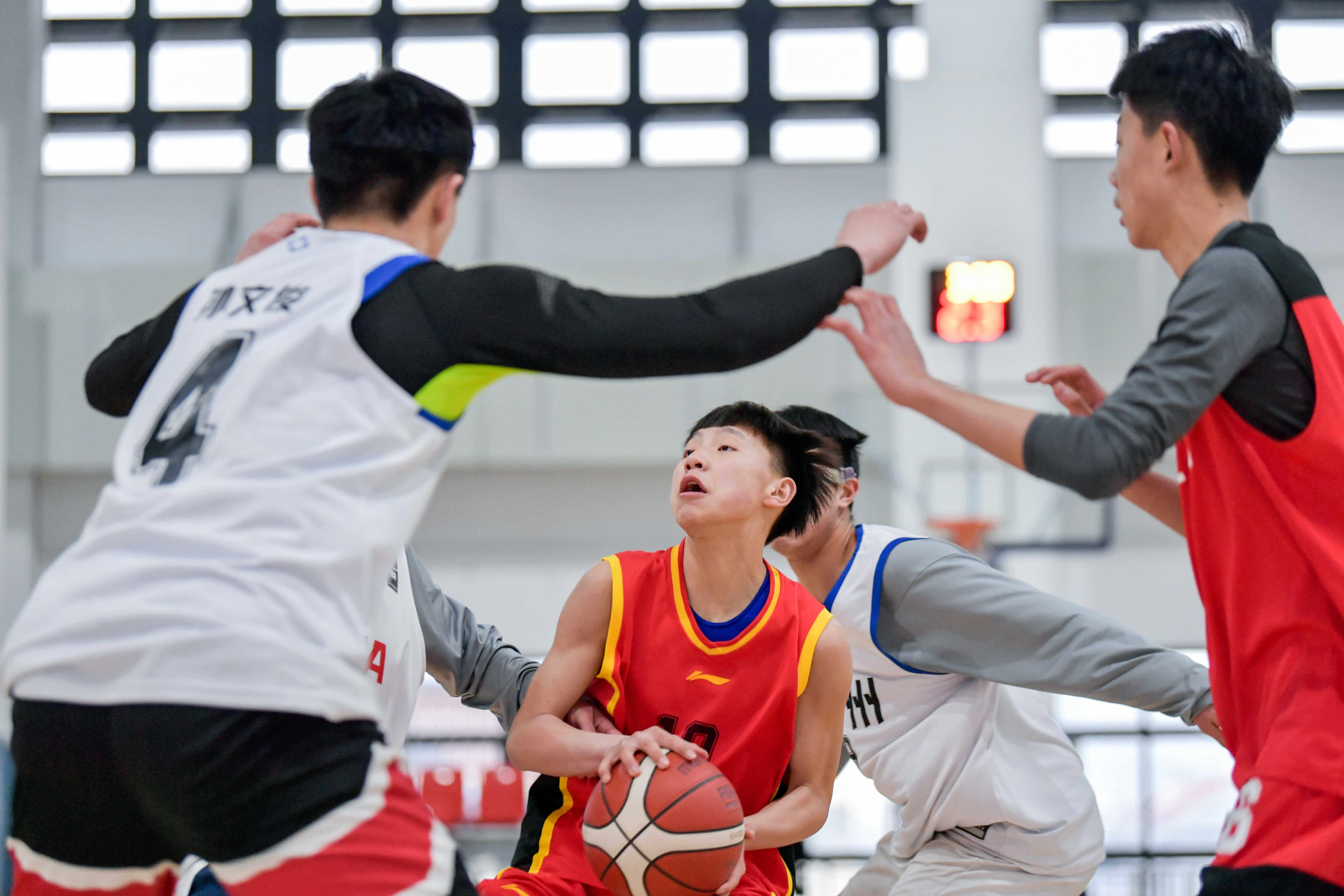 比赛开始,14-15岁组(红色队服)并没有因为身材稍弱而惧怕对抗,少年们敢打敢拼,多次冲击内线,哪怕被封盖也继续积极争抢二次篮板;此外,队伍抓住一切反击机会下快攻,令人眼前一亮。