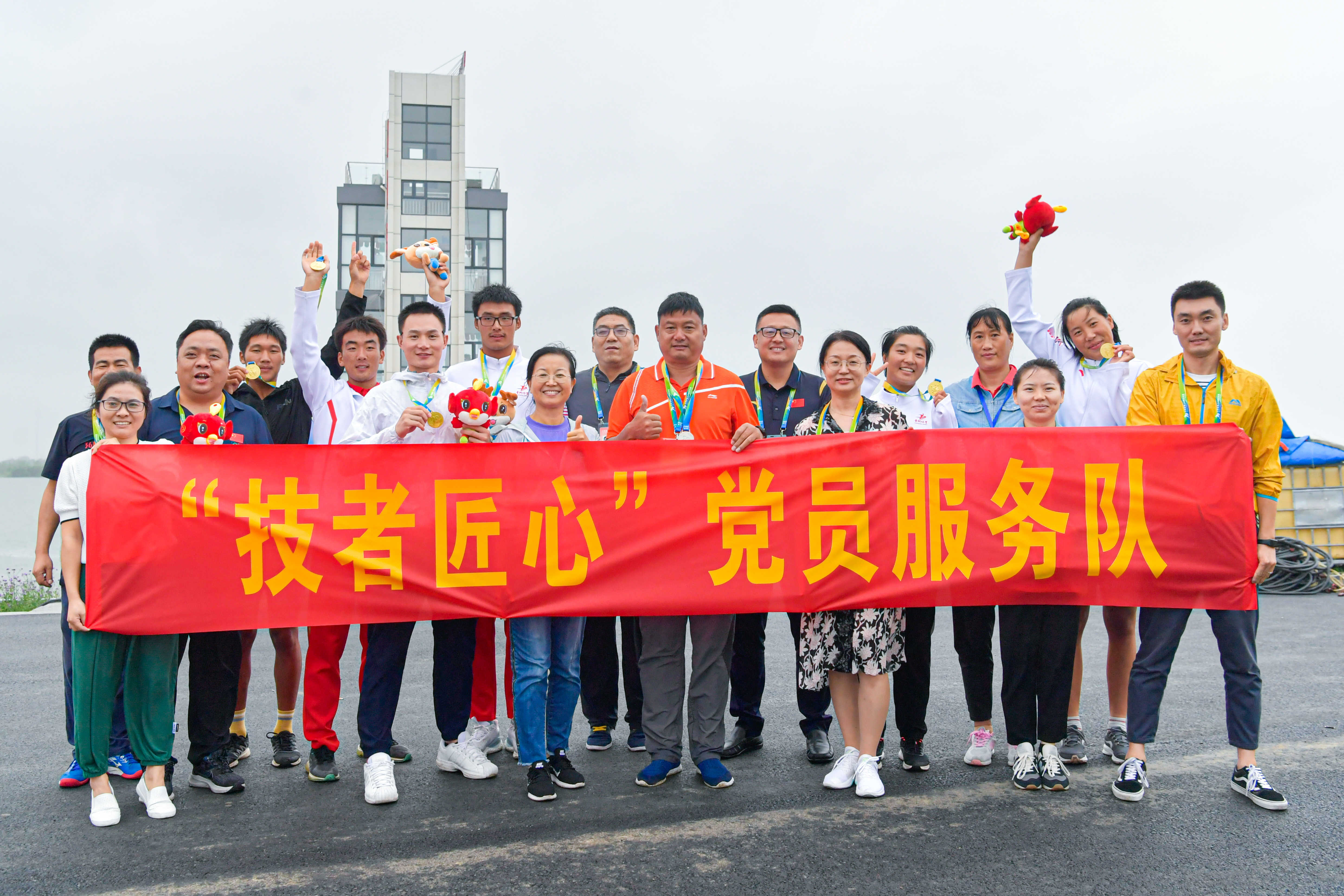 赛艇项目比赛期间,校党支部书记戚美琴带领“技者匠心”党员服务队近10人,特意来到泰州市水上运动中心比赛现场观战,为健儿们加油助威。