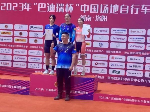十月底,同样在河南省洛阳市体育中心自行车馆举行的2023年“巴迪瑞杯”中国场地自行车联赛总决赛上,翟菲(图二中间)收获2金1银,先后夺得成年组女子争先赛冠军、女子凯林赛冠军、女子750米个人计时赛亚军。运动学校自行车队教练王兵(图二)也作为江苏队教练组的一员,出征本次比赛。