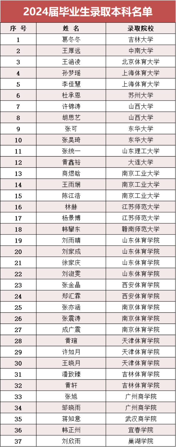 用拼搏创造奇迹,用成绩汇报社会。2024年全国体育单招录取工作已结束,学校上下高度重视,周密部署,齐心协力,取得不俗成绩。今年,学校共有37人被本科院校录取,其中多人被985、211、双一流院校录取!