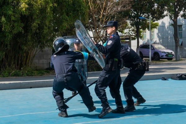 此外,现场还模拟了“可疑人员”持械强行闯入校园的情景,将理论教学与实践操作相结合,生动展示了防暴器材的使用方法及突发事件的处理流程。万队长提醒学校在遇到危险情况时要沉着冷静,及时报警,并要求安保人员保持对突发情况的敏感性,做到“多学习、多演练”。